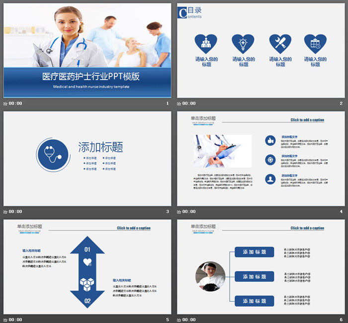 PowerPoint模板内容页面,使用稳重蓝色设计了22张幻灯片图表,方便制作医院工作汇报PPT。