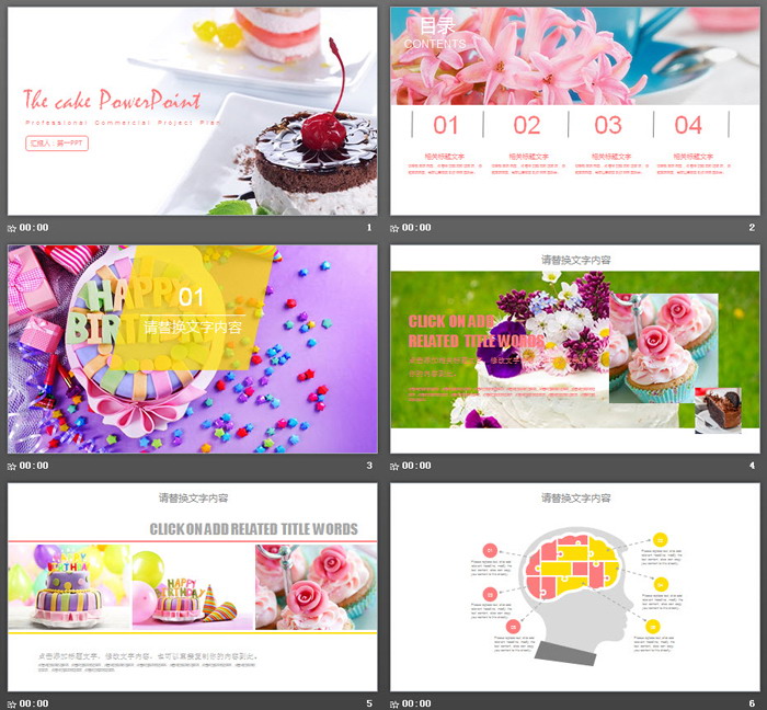 PPT模板内容页面,使用了粉色花卉、生日蛋糕、精致甜点作为排版素材,非常精美。