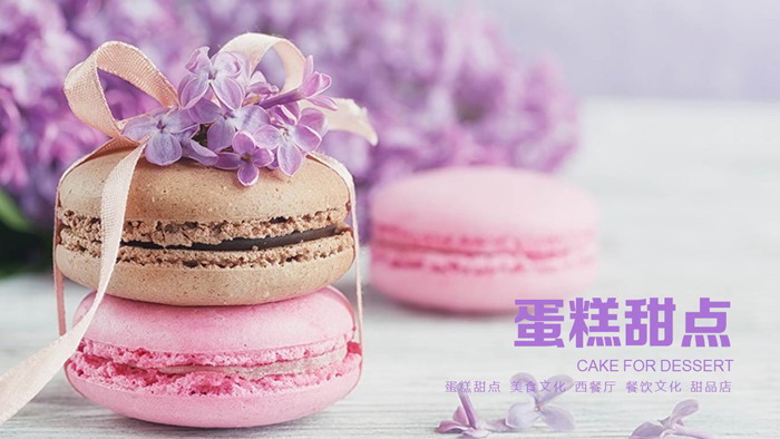 幻灯片模板封面,使用了三个美味的粉色甜点作为PowerPoint背景图片。甜点使用了紫色丝带包裹,非常精致。