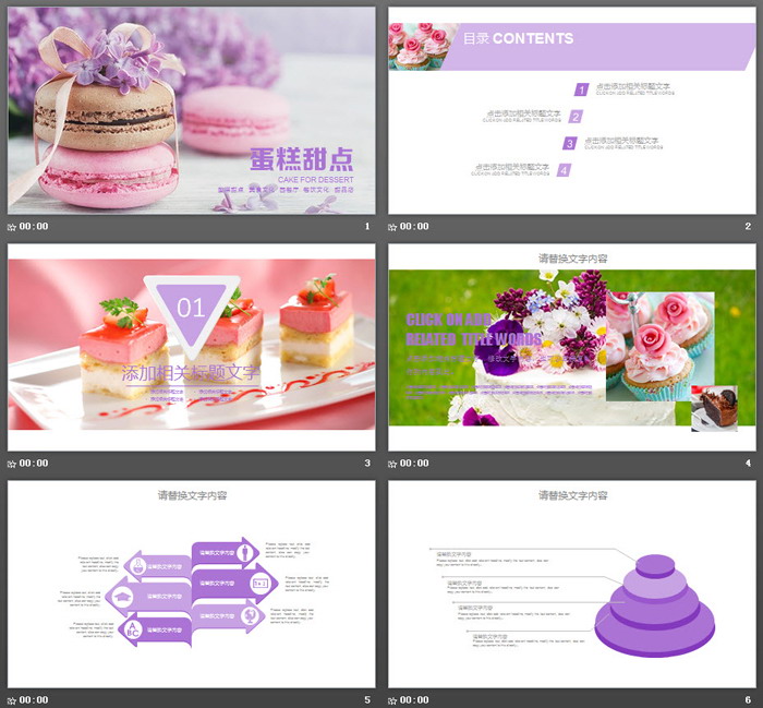 PowerPoint模板内容页面,使用了多张糕点图片、烘焙图片、草莓蛋糕图片进行排版设计。另外PPT模板自带了20张紫色扁平化图表,非常实用。