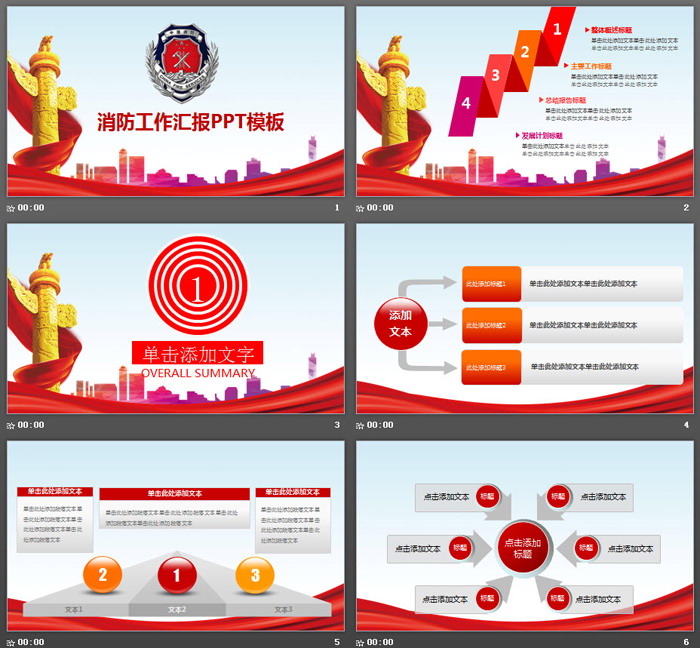 幻灯片模板封面,使用了消防警徽、华表、城市建筑剪影、红丝带作为背景图片,威武大气;