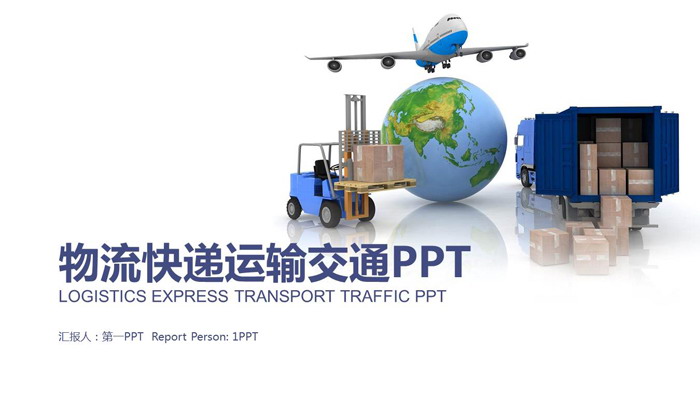 幻灯片模板封面,少用了货车、货物包装箱、叉车、地球等图片作为背景。与物流快递主题搭配。