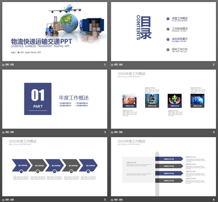 这是一套蓝色物流快递行业工作总结汇报PPT模板,共22张。