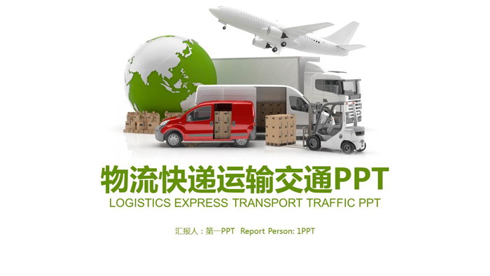 PPT封面,使用了绿色地球仪、白色卡车、叉车、面包车、红色货车等立体模型作为背景图片。与物流运输主题搭配。