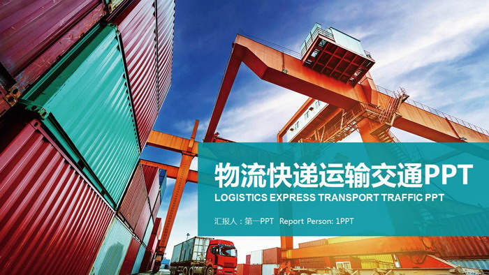 幻灯片模板使用了一张,正在码头进行集装箱运输的场景作为背景图片。与物流运输主题搭配。