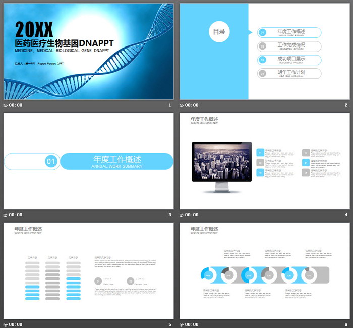 这是一套蓝色DNA链条背景的,医药医学PPT模板,共22张。