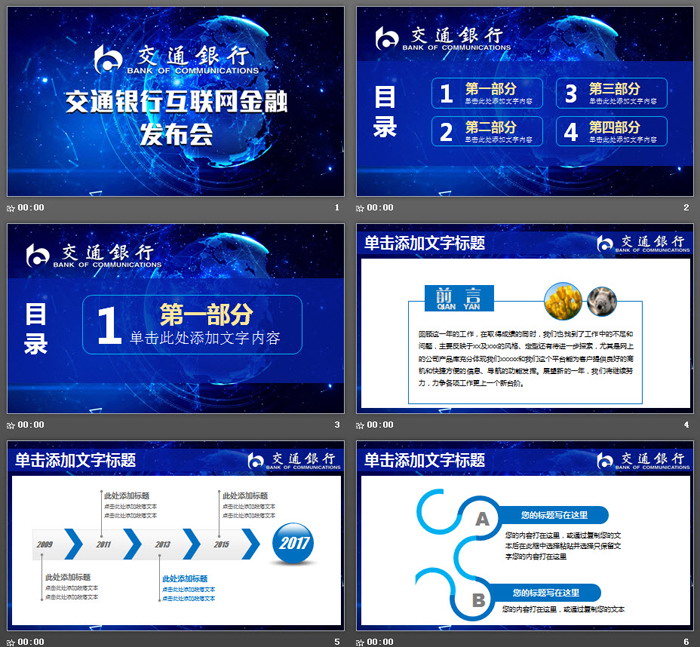这是一套蓝色星空背景的,交通银行专用PPT模板,共27张;