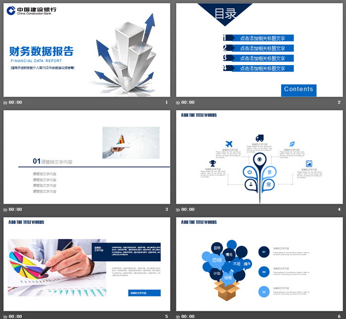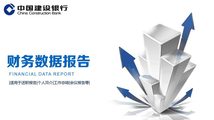 这是一套立体箭头背景的建设银行财务报告PPT模板,共22张。