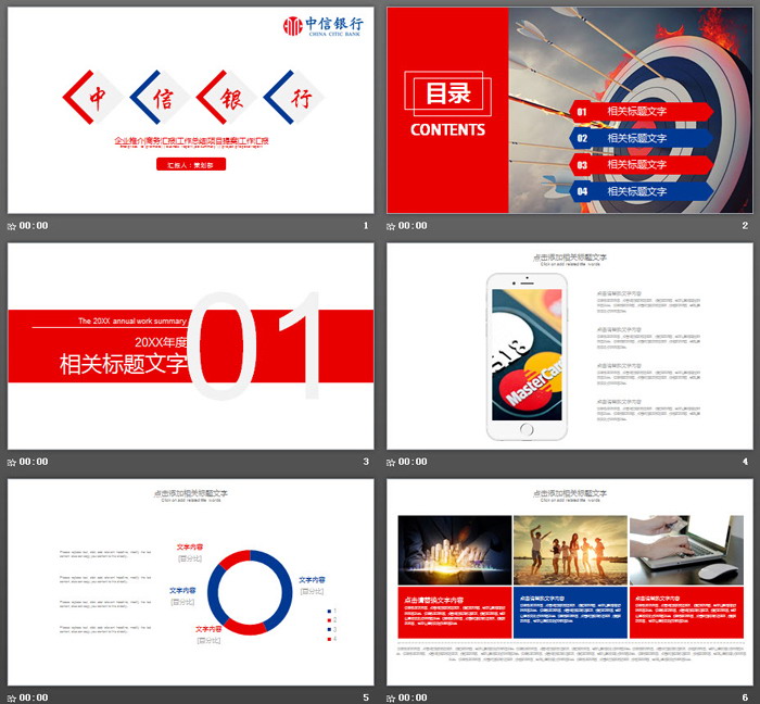 这是一套蓝红配色的,中信银行工作总结汇报PPT模板,共22张。