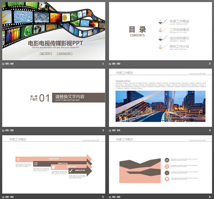 这是一套电影胶片背景的,影视传媒PPT模板,共22张。