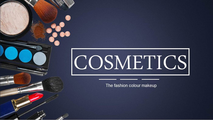 幻灯片模板封面,使用了一张蓝色径向渐变背景,左侧放置了各种名牌化妆品作为背景图片。右侧使用白色字体填写PPT标题;