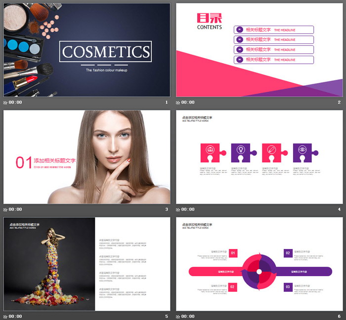 PowerPoint模板内容页面,使用了紫色与粉色搭配设计的20张扁平化幻灯片图表制作。另外使用了多张时尚化妆美女图片进行排版编辑。
