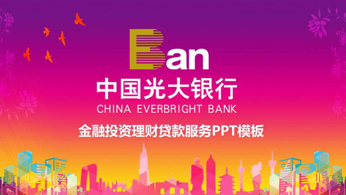 幻灯片模板封面,使用了一张紫色到黄色的渐变图片作为背景。上方放置光大银行logo,中间填写光大银行投资理财贷款服务PPT标题,下方使用了彩色城市剪影作为背景图片。界面设计精致饱满。