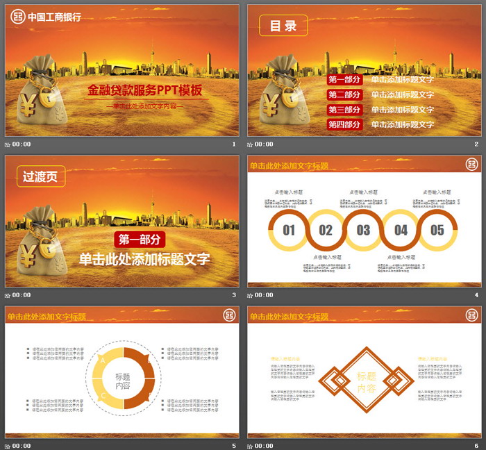 幻灯片模板封面,使用了金色城市建筑、钱袋子、货币符号等作为背景图片。中间填写金融贷款PPT标题。左上方放置中国工商银行logo。界面设计与金融行业贴切。
