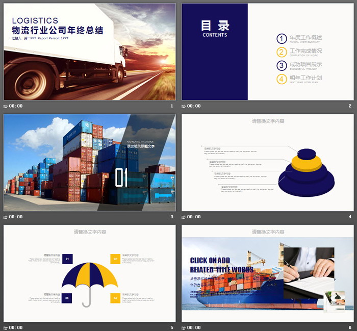 这是一套货车背景的,物流快递行业工作总结汇报PPT模板,共22张;