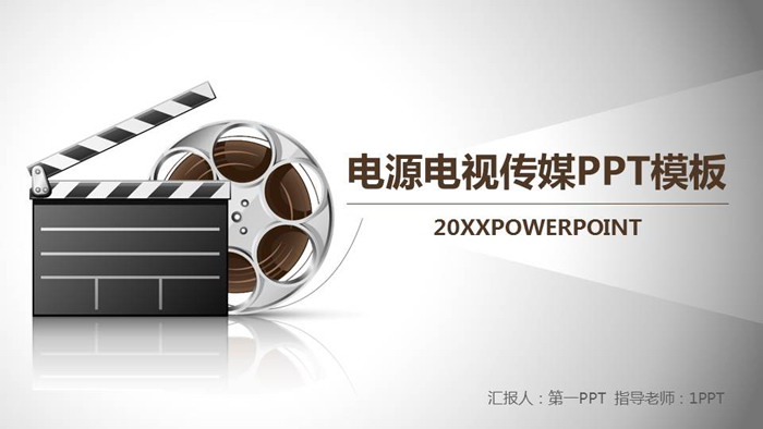 幻灯片模板封面,使用了黑白风格进行设计,一盘电影胶带+一块黑白场记板作为PPT背景图片。与电影电视、影视传媒主题贴切。
