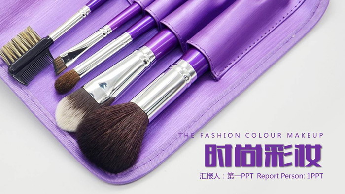 幻灯片模板封面,使用了紫色美妆刷作为背景图片。右下角填写时尚美妆PPT标题。界面设计时尚神秘。