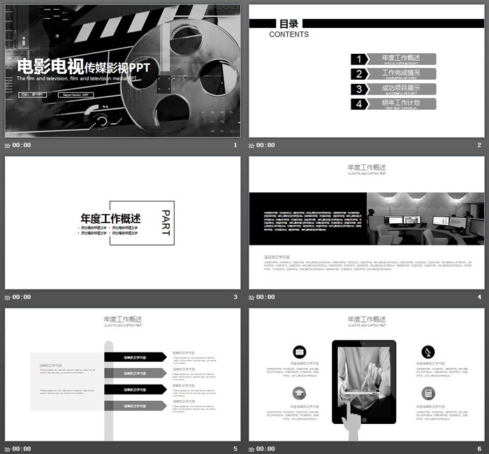 这是一套黑白风格的,电影电视影视传媒PPT模板,共22张。