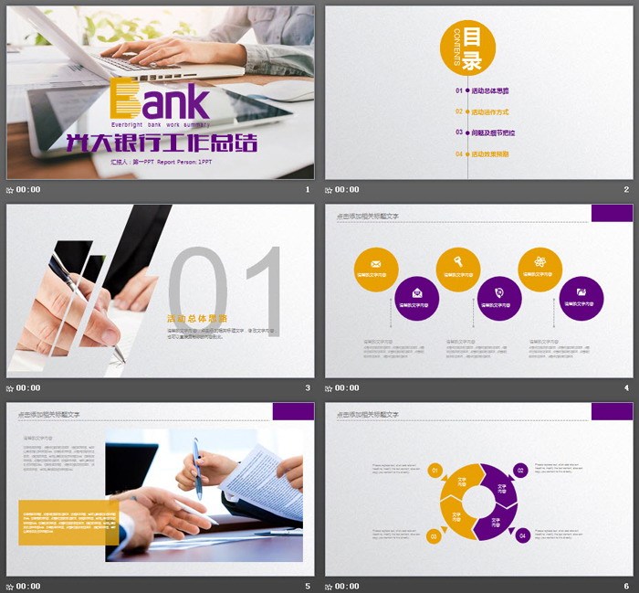 PowerPoint模板内容页,由20张紫色黄色幻灯片图表制作,每页幻灯片都带有动态PPT动画效果。