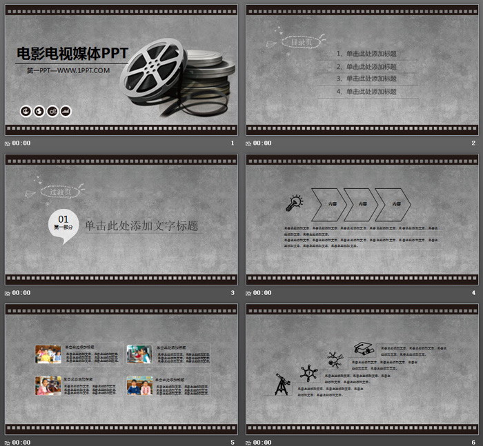 这是一张陈旧电影胶片背景的,影视传媒PPT模板,共27张;