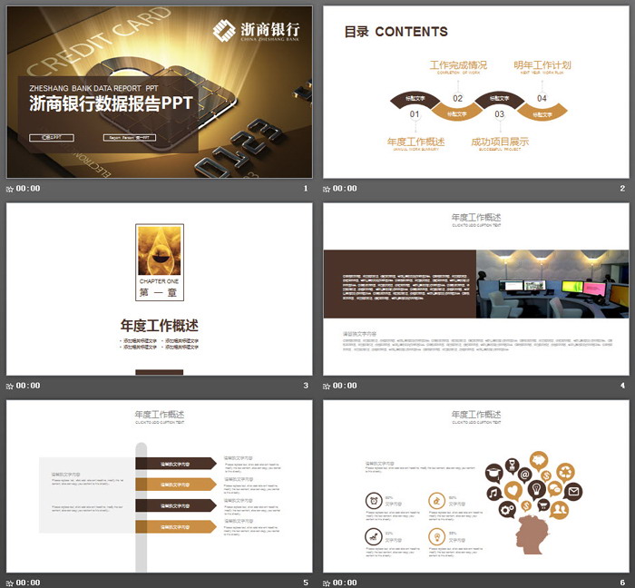 关键词:浙商银行幻灯片模板,棕色黄色扁平化PowerPoint图表,银行卡PPT背景图片,.PPTX格式;