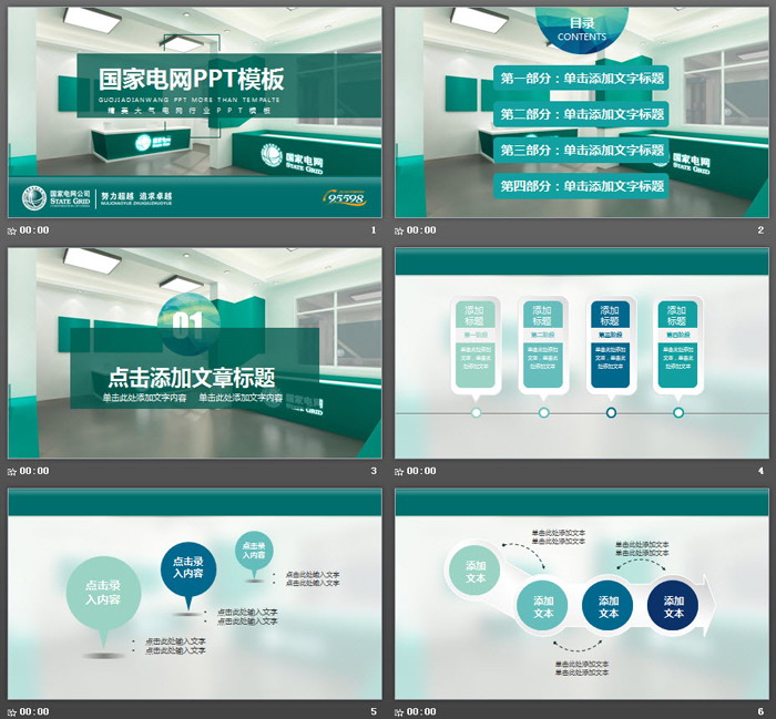 幻灯片以绿色为主色调进行设计。封面使用了一张国家电网接待室图片作为背景。中间使用了绿色半透明色块填写工作汇报PPT标题。下方放置国家电网logo和95598电话。