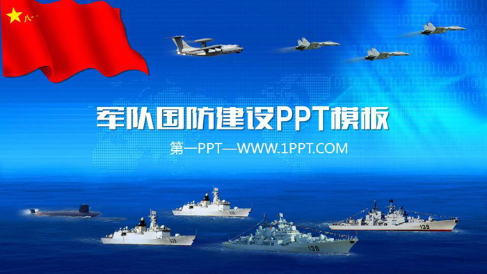 幻灯片模板封面,使用了蓝色大海上的航空母舰、蓝天上的战斗机,以及五星红旗作为背景元素。中间填写军队国防建设PPT标题。界面设计威武庄严与军事主题搭配。