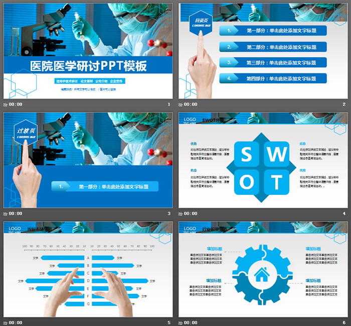 关键词:实验室、医生、显微镜幻灯片背景图片,蓝色扁平化PowerPoint图表,动态医疗医学研讨会PPT免费下载,.PPTX格式;