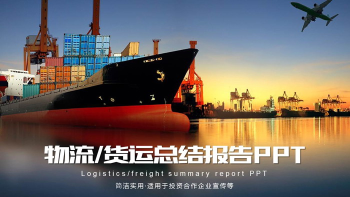 幻灯片模板封面,使用了停靠在码头,装满集装箱的货轮作为背景图片。中间使用白色字体填写物流行业PPT标题。界面设计与物流、货运主题搭配。
