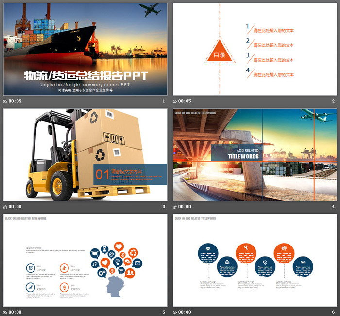 PowerPoint模板内容页,由20张蓝色橙色搭配的幻灯片图表制作。另外使用了飞机、叉车、集装箱、快递包裹、卡车、职场白领作为排版素材。