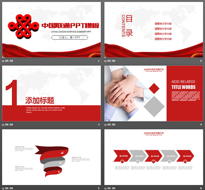 PowerPoint模板内容页,由23张红色灰色搭配的扁平化幻灯片图表制作。另外使用了联通公司员工图片、团队图片、职场图片进行排版编辑。