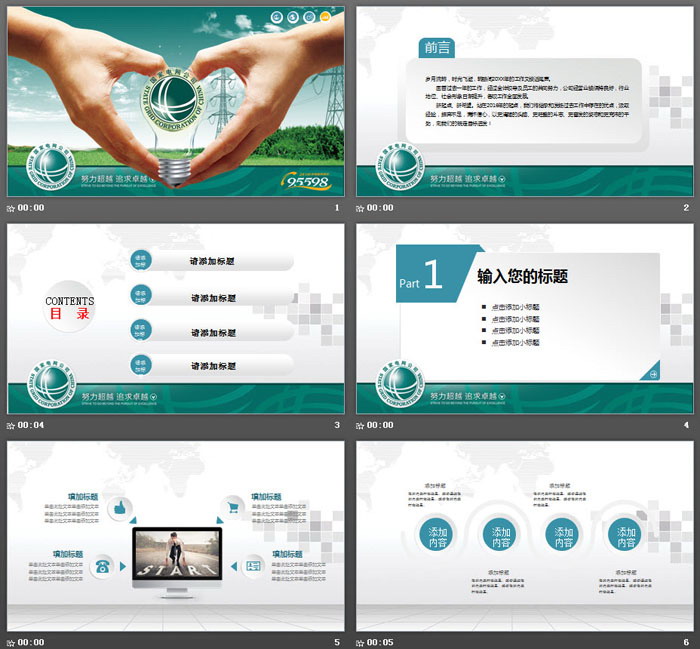 幻灯片模板封面,使用了蓝天白云、草地、森林、电塔作为背景图片。一个双手拿点灯的幻灯片动画放置中间。界面设计与电力、国家电网主题非常搭配。左下角放置国家电网公司logo和95598服务电话。