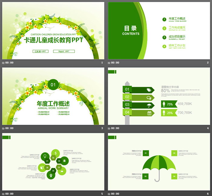 这是一套清新绿色花环背景的,儿童成长教育PPT模板,共19张;