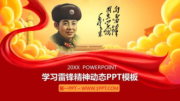 幻灯片模板封面,使用了金色祥云、天安门、红色彩带、雷锋画像作为背景图片。右侧放置毛主席题写的,向雷锋同志学习毛笔字。