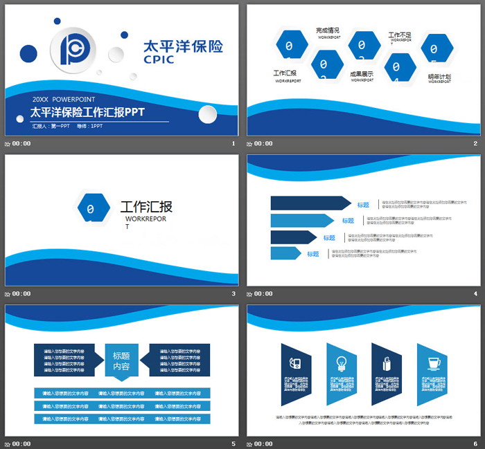 这是一套蓝色微立体风格的,太平洋保险PPT模板,共27张;