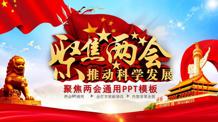 幻灯片模板封面,使用了蓝天白云、五星红旗、华表、五星红旗、红色彩带、金色石狮子等元素作为背景。中间放置五星围绕的《聚焦两会》艺术字作为PPT标题。