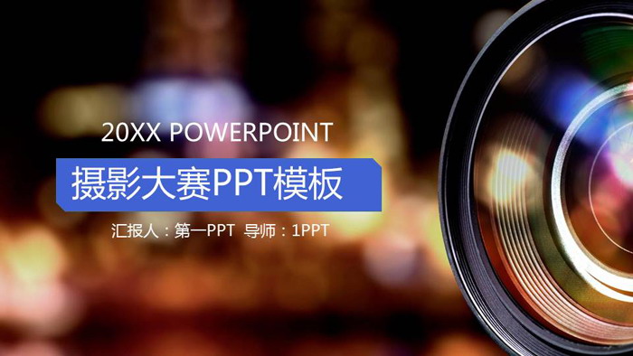 幻灯片模板封面,使用了模糊光斑、单反相机镜头作为背景图片。左侧填写摄影大赛PPT图表。