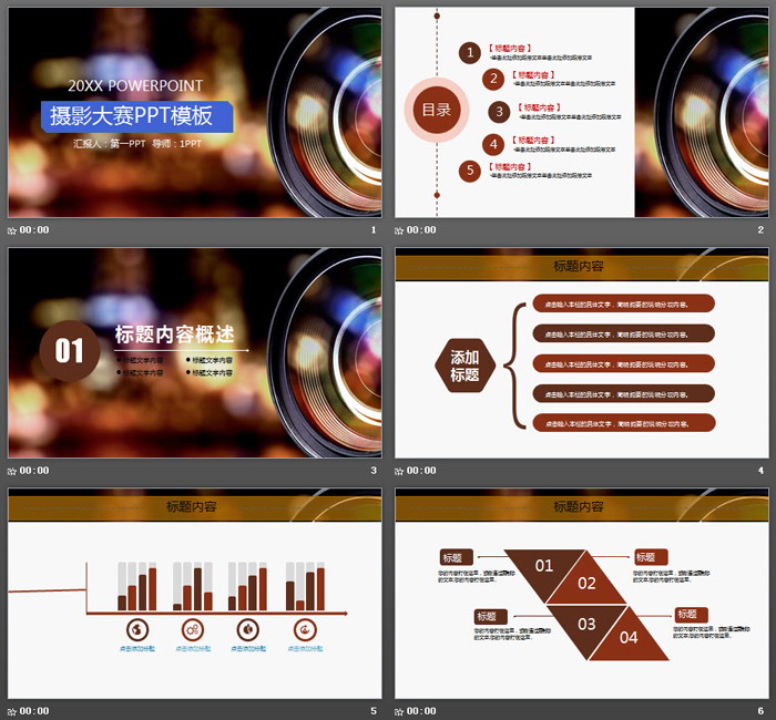 这是一套单反镜头背景的,摄影大赛PPT模板,共27张;