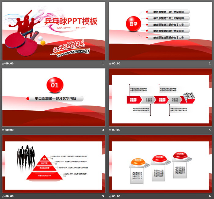 幻灯片模板封面,使用了红色曲线、乒乓球运动员剪影、乒乓球拍和2个乒乓球作为背景图片。中间填写PPT标题,右下角使用了我运动我快了艺术字作为PPT副标题。