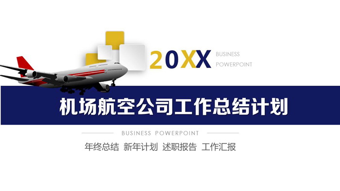 幻灯片模板封面,使用了一张飞机图片作为背景。中间使用蓝色彩条填写,机场航空公司工作总结汇报PPT标题。界面设计与航空主题搭配。