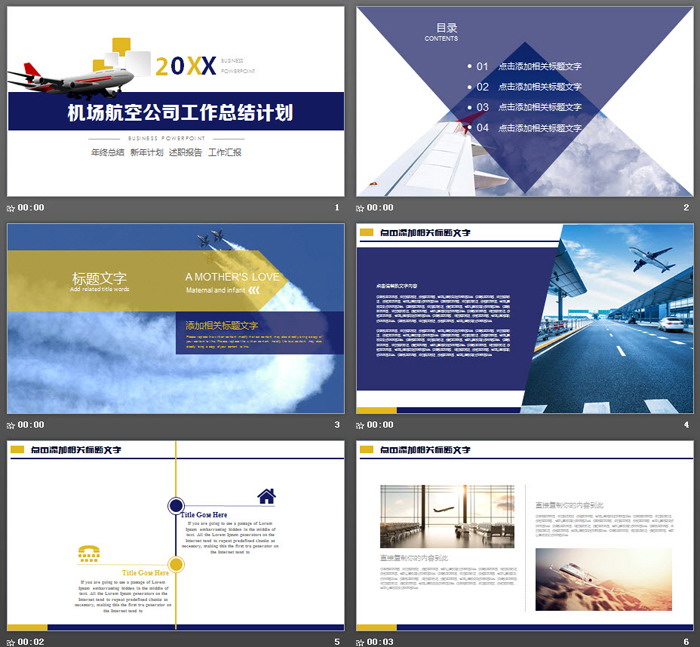 PowerPoint模板内容页,由24张蓝色黄色搭配的扁平化幻灯片图表制作。另外使用了多张机场图片、飞机图片进行排版编辑。