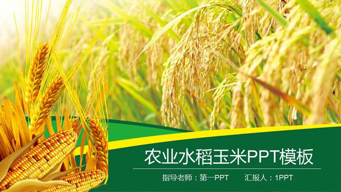 幻灯片模板封面,使用了稻田里的水稻、玉米和小麦作为背景图片。右下方填写PPT标题。界面背景与农业主题搭配。