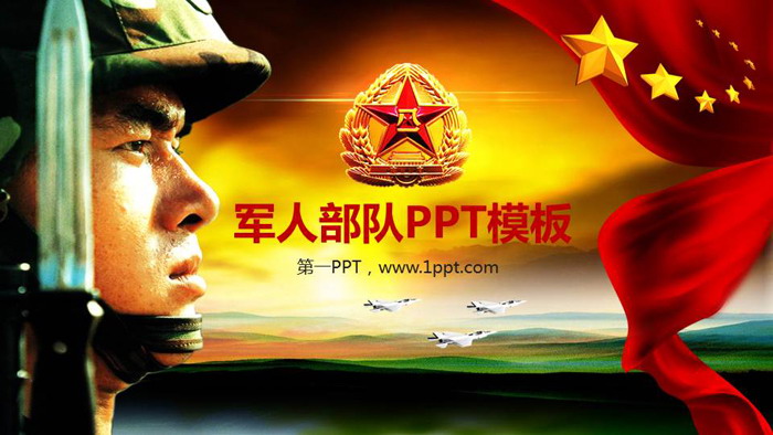 幻灯片模板封面,使用了手持钢枪的军人、八一军徽、红色彩带、战斗机等元素作为背景。中间填写军人部队PPT标题。
