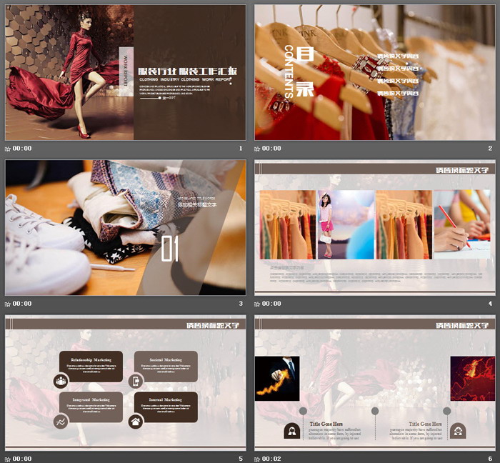 PowerPoint模板内容页,由24张棕色扁平化幻灯片图表制作。另外使用了多张服装设计图纸、潮流服饰作为排版素材。