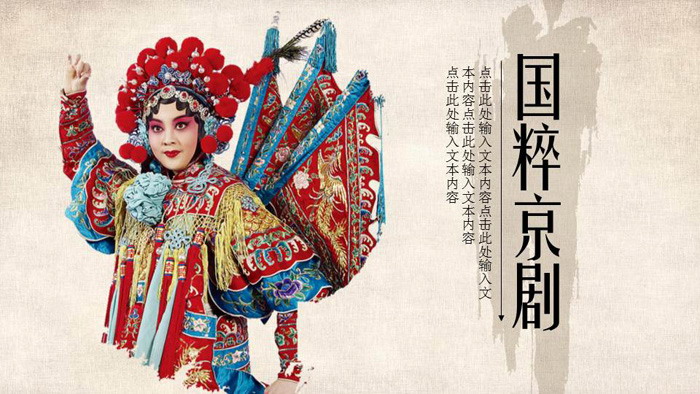 幻灯片模板封面,使用了一张精美的京剧角色作为背景图片。右侧填写国粹京剧PPT标题文字。
