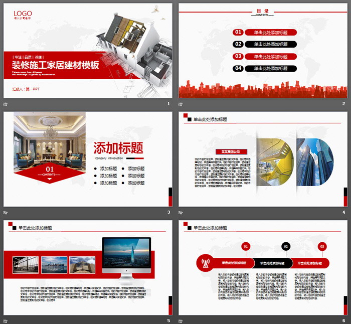 PowerPoint模板内容页,由24张红色黑色搭配的扁平化幻灯片图表制作。另外使用了多张室内装修设计效果图进行装饰。