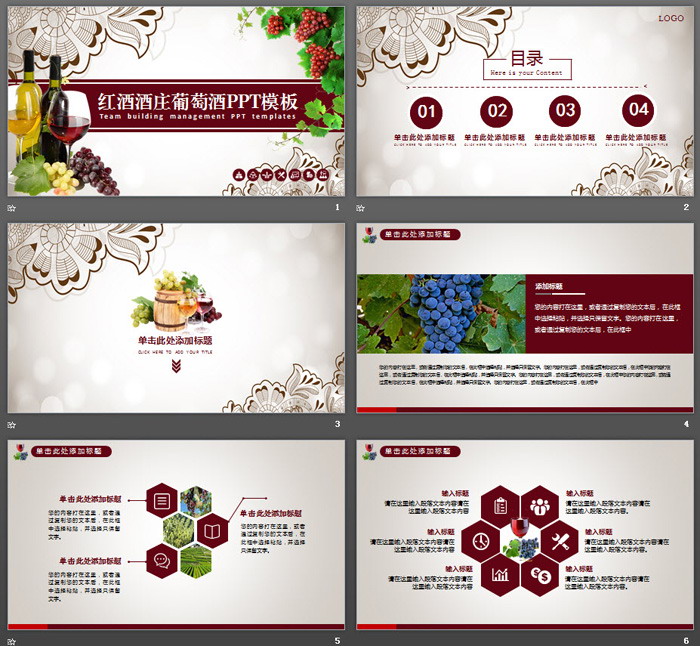 PowerPoint模板内容页,由24张酒红色幻灯片图表制作。另外使用了葡萄庄园、葡萄酒等图片进行排版。
