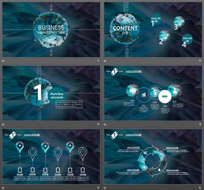 幻灯片模板使用了一张带有空间扭曲感的蓝色图片作为底图。PPT模板封面放置了一个立体星球图片作为背景图片。中间填写PPT标题文字,界面设计炫酷时尚,与科技主题搭配。