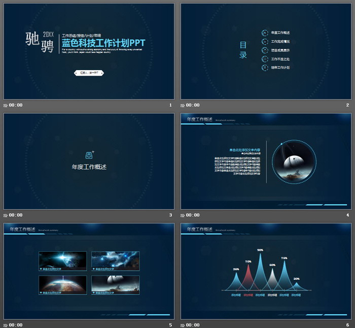 PowerPoint模板内容页,由26张蓝色红色搭配的扁平化幻灯片图表制作。另外使用了多张星际图片、科幻图片进行排版制作。