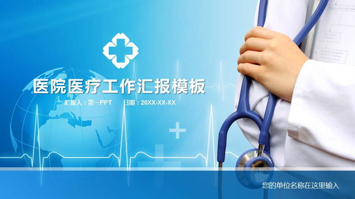 幻灯片模板封面,使用了听诊器、医生、波形图等元素作为背景图片。左侧填写医院医疗报告PPT标题文字。界面元素与医疗主题搭配。